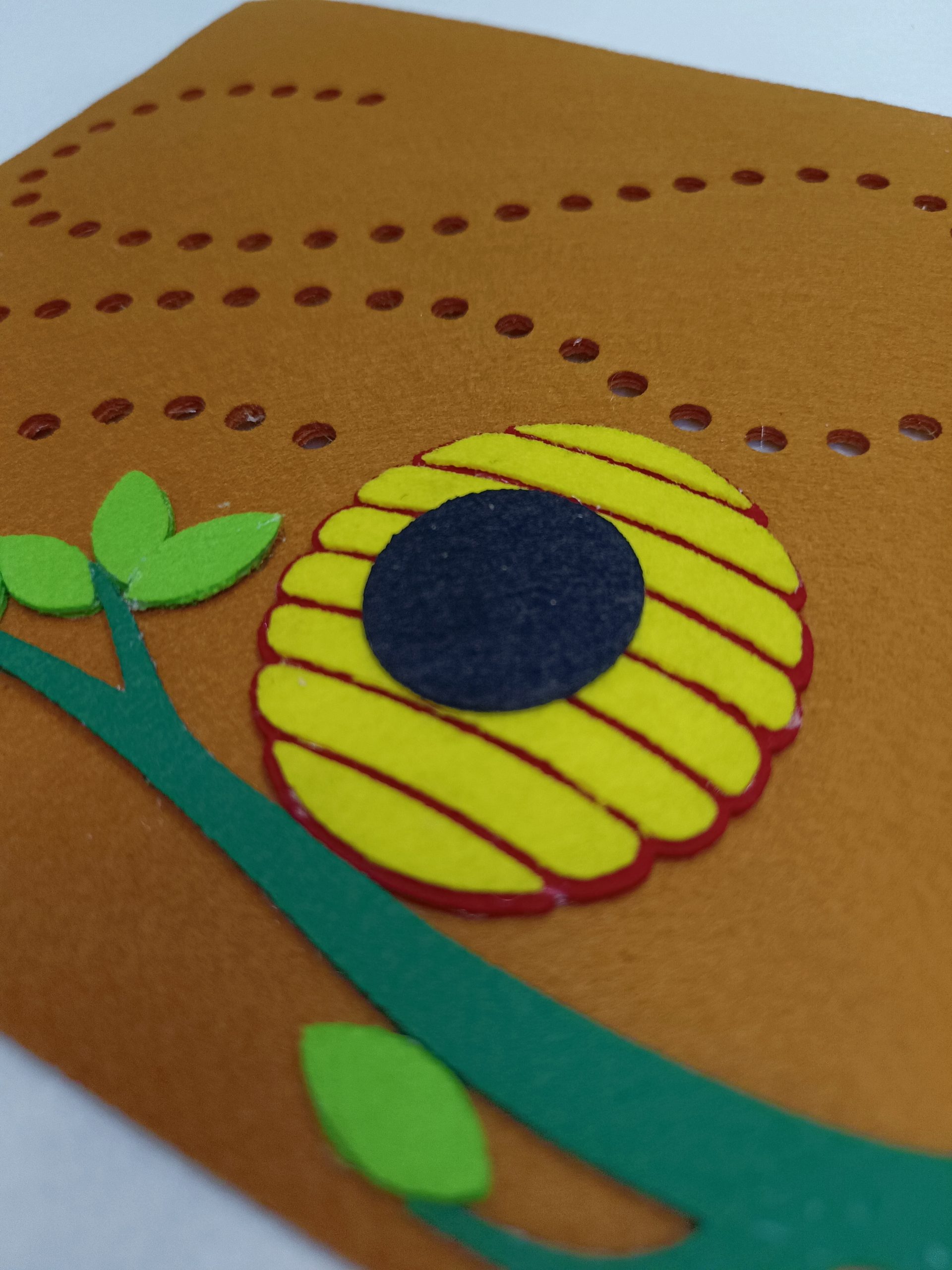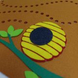 Interactive Sewing Beehive Activity: This Quiet Book page features a playful beehive and a friendly bee attached to a string. Children use a safe, child-friendly needle to guide the bee through the holes in the beehive, simulating the sewing process. This activity encourages precision, patience, and creativity.